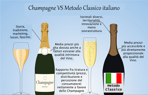 Oggi dismetto i panni di comunicatore e di WineBlogger e parlo da italiano medio, ovvero da ciò che sono veramente! Mi chiedevo… ma siamo davvero disposti a spendere 5,10,20 … volte di più per uno Champagne che per un Metodo Classico italiano, solo perché il “brand” Champagne è connesso ad un’esperienza che trascende il puro gusto? Stavo leggendo un articolo in un blog americano in cui si sostiene che lo Champagne sia autentico, ma è davvero così? O meglio, sono tutti così autentici? Lasciando fuori dall’equazione le bottiglie rare e le piccole tirature, parliamo spesso di etichette che sono davvero ovunque! Ma soprattutto, perché quando parliamo di Vino italiano ci preoccupiamo persino di che tipo di leguminosa si usi per il sovescio, mentre quando parliamo di Champagne l’importante è che sia Champagne e, “meglio” ancora, che costi caro!? Io rispetto tutti gli amanti del genere e da una parte li invidio, in quanto, di certo, dedicandomi per il 90% a piccole aziende italiane e non avendo budget per grandi bolle d’oltralpe non posso avere una reale visione d’insieme, ma facendola semplice semplice, ad oggi, tolto il marketing ed il marketting, è ancora così ampio il divario fra Metodo Classico italiano e Champenoise? Se sì, cosa hanno di più i padri della bolla? Se no, quali sono i Metodo Classico che distruggono i fratelloni Champagne in termini di qualità-prezzo?