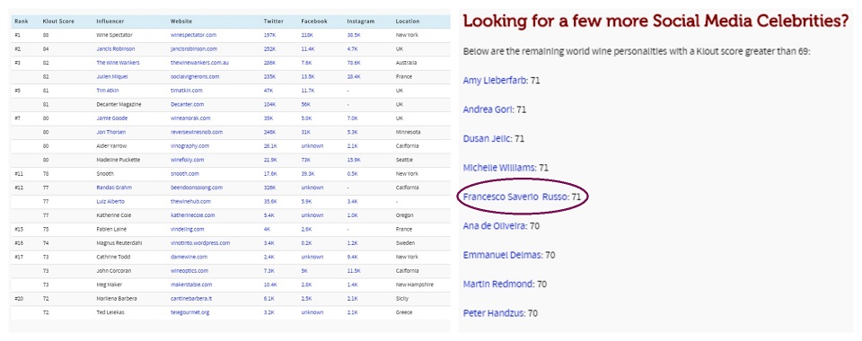 Sia chiaro, molti dei nomi che troverete in classifica sono dei mostri sacri, delle icone del Vino a livello globale che meritano un inchino infinito e che vantano maggiori competenze ed esperienze di me, quindi il mio è un nome che poteva tranquillamente non esserci e nessuno si sarebbe domandato il perché, ma lasciate che sia fiero di rappresentare il Vino italiano, insieme ad una grande produttrice e comunicatrice come Marilena Barbera (nutro una sana invidia circa la sua capacità di utilizzo dei social e berrei il suo rosato a tutte le ore del giorno! :-p) ed il preparatissimo Andrea Gori (Vinodaburde ed Intravino), nel novero dei più importanti (sempre secondo klout) wine influencers internazionali. Troverete Marilena nella classifica principale, mentre io ed Andrea siamo tra le segnalazioni “extra” nella sezione “Looking for a few more Social Media