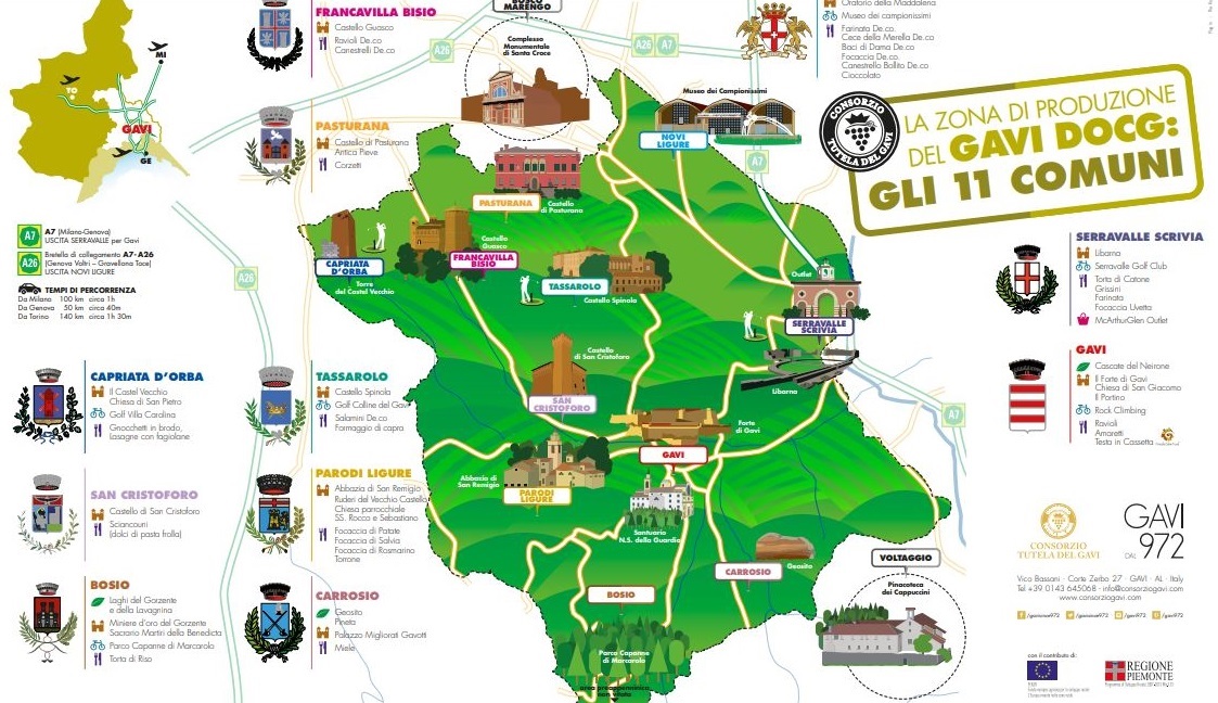 La denominazione che comprende i territori di 11 comuni della Provincia di Alessandria: Bosio, Capriata d’Orba, Carrosio, Francavilla Bisio, Gavi, Novi Ligure, Parodi Ligure, Pasturana, San Cristoforo, Serravalle Scrivia, Tassarolo.