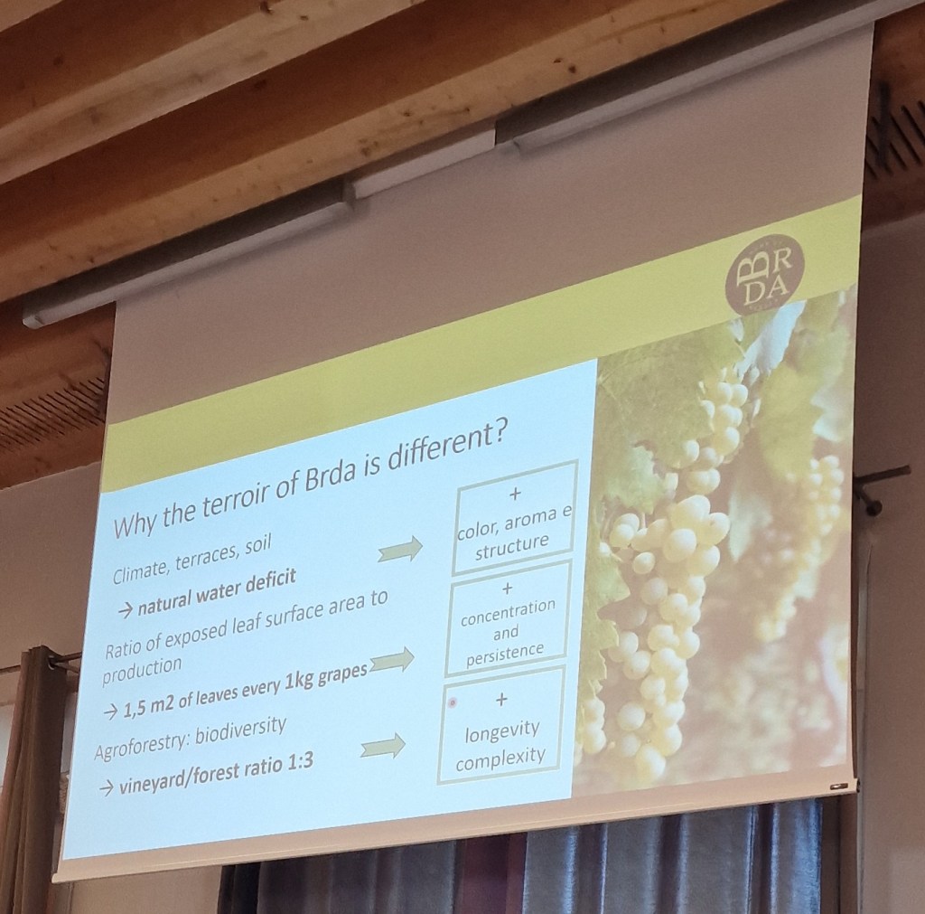 Terre non particolarmente fertili ma ricchissime di sali minerali, microelementi e fossili marini che caratterizzano in maniera inconfondibile il profilo organolettico dei vini, dallo spettro olfattivo più fine, austero e minerale a quello gustativo con una tessitura quasi gessosa e chiusure lungamente saline. A livello strutturale il pedoclima locale permette un grande equilibrio fra materia e slancio, fra ottime maturazioni tecnologiche, buon nerbo acido e fenoliche che, nonostante gli esiti dei cambiamenti climatici, non si fanno attendere troppo (sia nei rossi che nel vitigno principe di queste terre: la Rebula). Questo, anche, grazie alla rinnovata consapevolezza agronomica dei viticoltori sloveni che hanno imparato, meglio di altri, sia annate calde e siccitose (sempre più frequenti) che criticità legate all’abbondante piovosità come quelle affrontate quest’anno. Interessante l’indagine condivisa con l’agronomo Giovanni Bigot, che ha delineato le specificità della pedologia di BRDA legate al mesoclima locale e alla sua evoluzione nell’era dei cambiamenti climatici, mostrando la capacità della Rebula di reggere meglio di altre varietà all’inesorabile impatto del global warming.